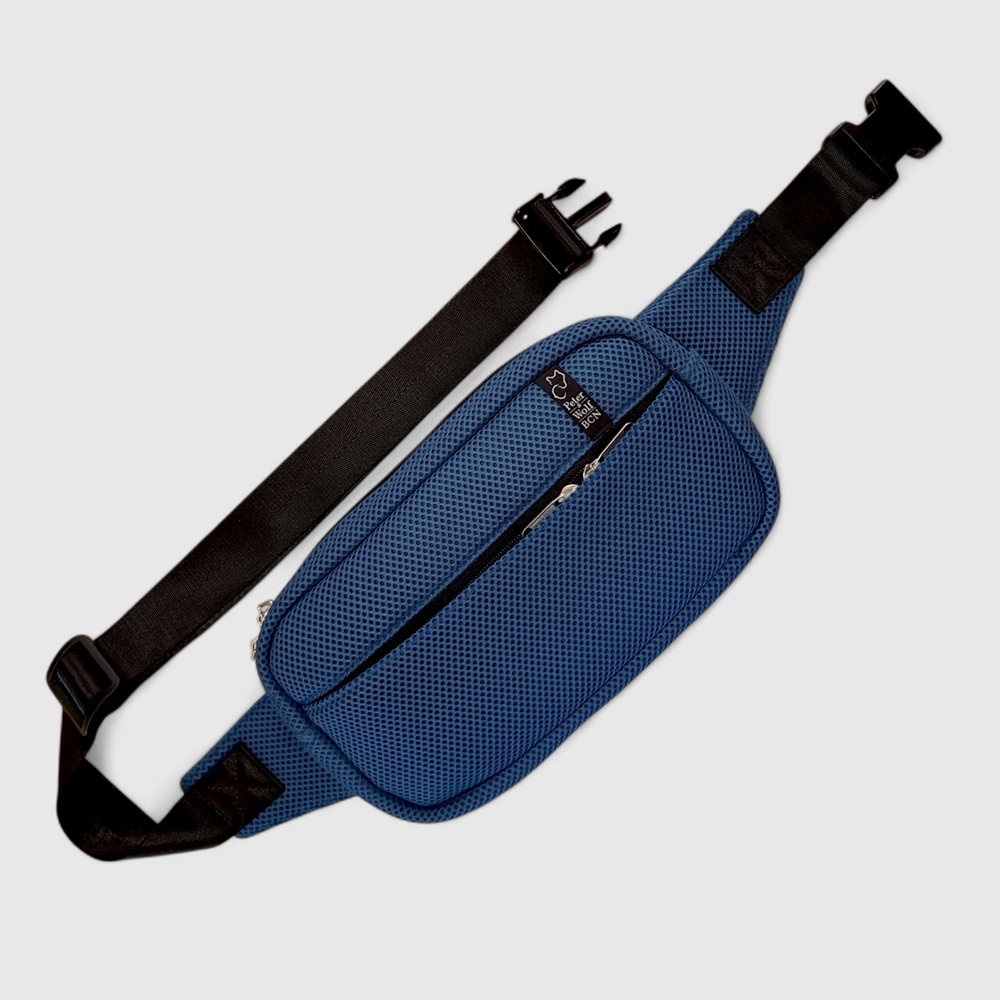 Riñonera XL Sport Sailor en tejido técnico 3D color azul marino confeccionada a mano. Bolsillo exterior con cremallera de doble carro, 3 bolsillos interiores, uno con cremallera. Bandolera de 4 cm de ancho con mosquetón. Medidas: 29 x 17 x 5 cm (largo x alto x fondo)